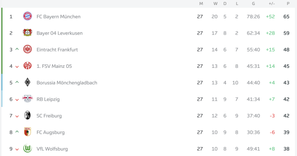 За підсумками 27-го туру “Баварія” залишається лідером Бундесліги, набравши 65 очок. У топ-5 також перебувають “Баєр”, “Айнтрахт”, “Майнц” та “Боруссія” Менхенгладбах.