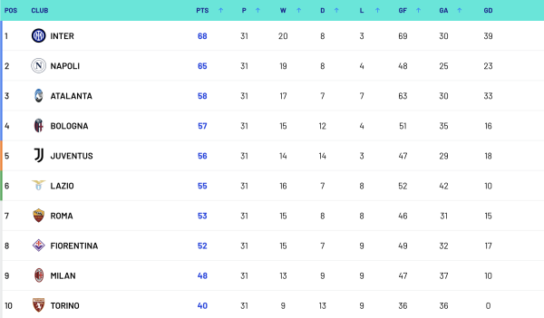 Після 31-го туру “Інтер” перебуває на чолі турнірної таблиці Серії А – в їхньому активі 68 набраних очок. Слідом за “Інтером” ідуть “Наполі”, “Аталанта”, “Болонья” та “Ювентус”.