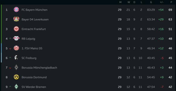 Відомо, як виглядає турнірна таблиця німецької Бундесліги після матчів 29-го туру чемпіонату.