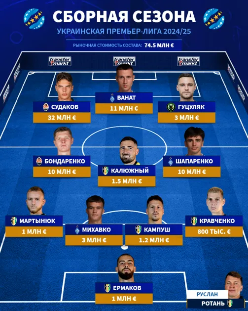 Стала відома символічна збірна сезону Української Прем’єр-ліги за версією Transfermarkt.