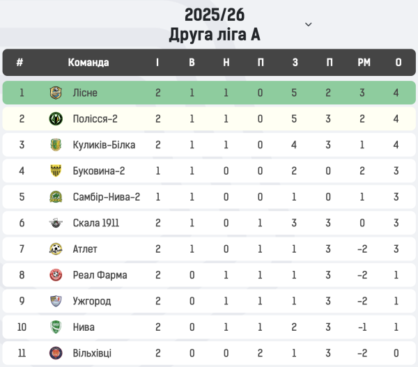 На чолі турнірної таблиці Групи А Другої ліги перебувають три команди – “Лісне”, “Полісся-2” та “Куликів-Білка” набрали по 4 очки. Водночас, завдяки кращим додатковим показникам саме “Лісне” перебуває на 1-му місці.