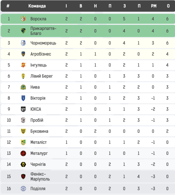На чолі турнірної таблиці Першої ліги перебувають три команди – “Ворскла”, “Прикарпаття-Благо” та “Чорноморець”, які набрали максимальні 6 очок. “Агробізнес” та “Інгулець” доповнюють чільну п’ятірку, маючи в активі 4 залікові бали.