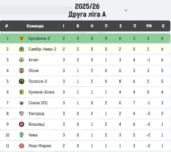 На чолі турнірної таблиці Групи А Другої ліги перебувають три команди – “Буковина-2”, “Самбір-Нива-2” та “Атлет” набрали по 6 очок. Водночас, завдяки кращим додатковим показникам саме “Буковина-2″ перебуває на 1-му місці.