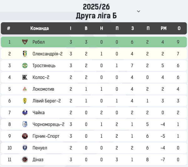 Тим часом, у Групі Б Другої ліги є одноосібний лідер – ним став “Ребел”, який набрав максимальні 9 очок у 3 матчах. Топ-5 доповнюють “Олександрія-2”, “Тростянець”, “Колос-2” та “Локомотив”.