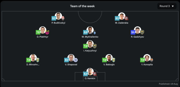 За даними аналітиків, до символічної збірної 3-го туру УПЛ потрапили Олександр Кемкін (“Кривбас”), Денис Мірошніченко (“Карпати”), Владислав Шаповал (“Кудрівка”), Владислав Бабогло (“Карпати”), Юхим Конопля (“Шахтар”), Іван Калюжний (“Металіст 1925”), Дмитро Плахтир (“Полтава”), Микола Михайленко (“Динамо”), Рамік Гаджиєв (“Металіст 1925”), Пилип Будківський (“Зоря”) та Максим Задерака (“Кривбас”).