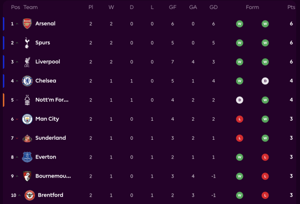 Після 2-го туру на чолі турнірної таблиці АПЛ перебувають “Арсенал”, “Тоттенгем” та “Ліверпуль”, які набрали максимальні 6 очок. У топ-5 також знаходяться “Челсі” та “Ноттінгем Форест”, які мають в активі по 4 очки.