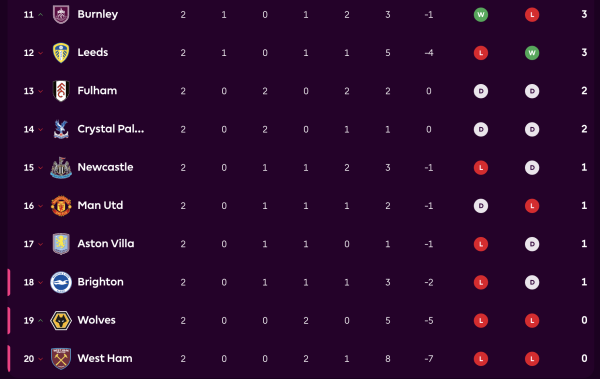 Замикають турнірну таблицю АПЛ “Вулвергемптон” та “Вест Гем”, які поки що очок не набирали.