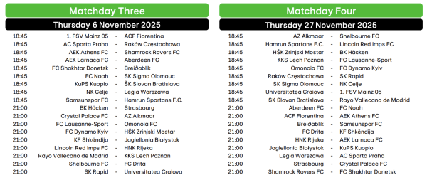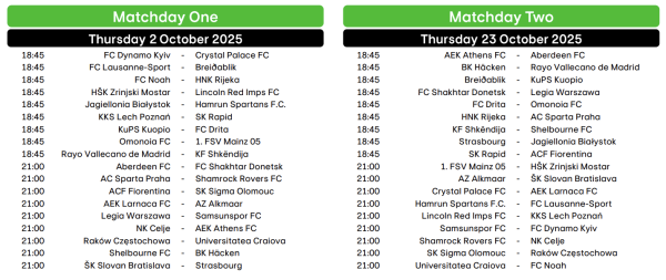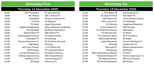 Розклад матчів основного етапу Ліги конференцій 2025/26 (вказано центральноєвропейський час):