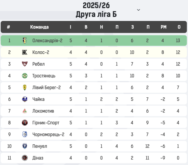 Тим часом, “Олександрія-2” із 13 заліковими очками очолює Групу Б Другої ліги. Слідом ідуть “Колос-2”, “Ребел”, “Тростянець” та “Лівий Берег-2”.