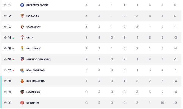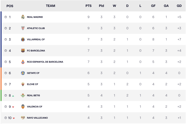 Наразі турнірну таблицю Ла Ліги очолюють “Реал” та “Атлетік”, які набрали максимальні 9 очок. “Вершкові” перебувають вище завдяки кращим додатковим показникам. У топ-5 також перебувають “Вільярреал”, “Барселона” та “Еспаньйол”.