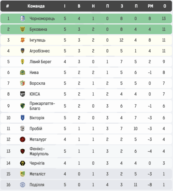 Наразі “Чорноморець” очолює турнірну таблицю Першої ліги, маючи в активі 13 очок. “Буковина” також перебуває в зоні прямого виходу в УПЛ, а “Інгулець” та “Агробізнес” знаходяться в зоні перехідних матчів із клубами УПЛ.
