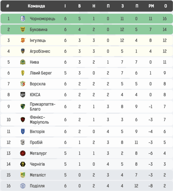 “Чорноморець” продовжує очолювати турнірну таблицю Першої ліги, набравши 16 очок. “Буковина” також перебуває в зоні прямого виходу в УПЛ, а “Інгулець” та “Агробізнес” знаходяться в зоні перехідних матчів із клубами УПЛ.