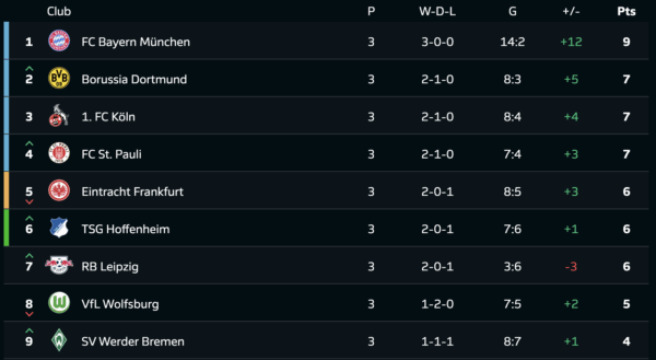 “Баварія” одноосібно очолює турнірну таблицю Бундесліги, набравши максимальні 9 очок. Топ-5 доповнюють “Боруссія” Дортмунд, “Кельн”, “Санкт-Паулі” та “Айнтрахт”.