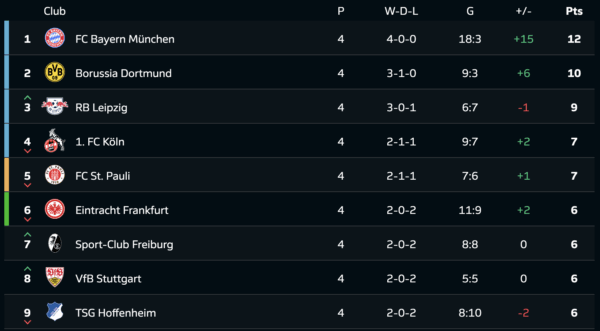 “Баварія” продовжує очолювати турнірну таблицю Бундесліги, набравши максимальні 12 очок. Топ-5 доповнюють “Боруссія” Дортмунд, “Лейпциг”, “Кельн” та “Санкт-Паулі”.
