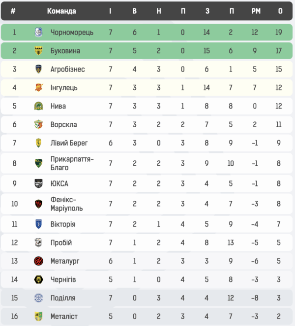 “Чорноморець” залишається лідером турнірної таблиці Першої ліги, маючи в активі 19 очок. “Буковина” також перебуває в зоні прямого виходу в УПЛ, а “Агробізнес” та “Інгулець” знаходяться в зоні перехідних матчів із клубами УПЛ.