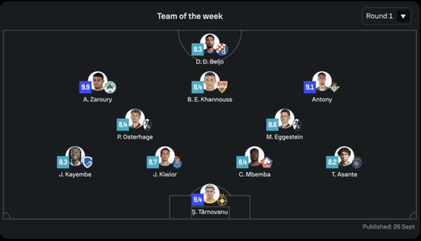 За даними аналітиків, до символічної збірної 1-го туру основного етапу Ліги Європи потрапили Штефан Тирновану (“ФКСБ”), Жоріс Кайембе (“Генк”), Якуб Ківьйор (“Порту”), Шансель Мбемба (“Лілль”), Тайріс Асанте (“Маккабі” Тель-Авів), Патрік Остерхаге (“Фрайбург”), Максіміліан Еггештайн (“Фрайбург”), Анасс Зарурі (“Панатінаїкос”), Білал Ель-Ханнус (“Штутгарт”), Антоні (“Бетіс”) та Діон Бельйо (“Динамо” Загреб).