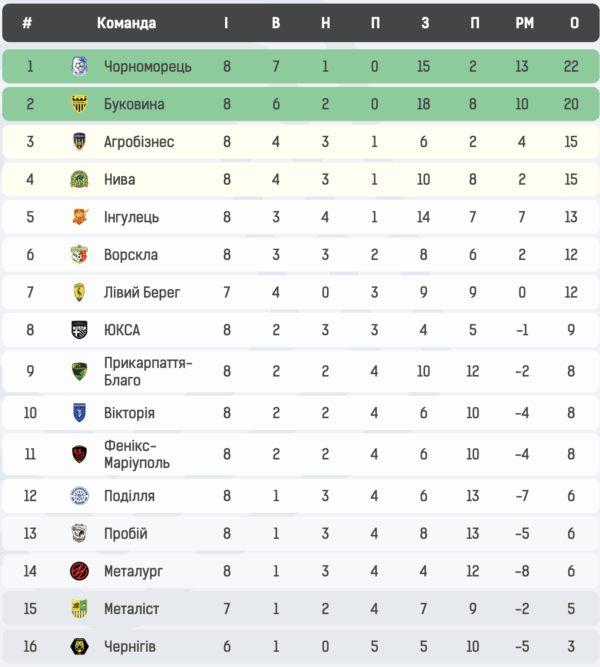 “Чорноморець” залишається лідером турнірної таблиці Першої ліги, маючи в активі 22 очки. “Буковина” також перебуває в зоні прямого виходу в УПЛ, а “Агробізнес” та тернопільська “Нива” знаходяться в зоні перехідних матчів із клубами УПЛ.