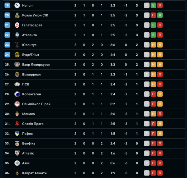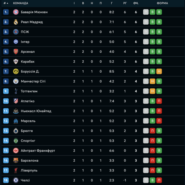 Наразі на чолі турнірної таблиці перебувають “Баварія”, “Реал”, “ПСЖ”, “Інтер”, “Арсенал” та “Карабах”, які набрали максимальні 6 очок.