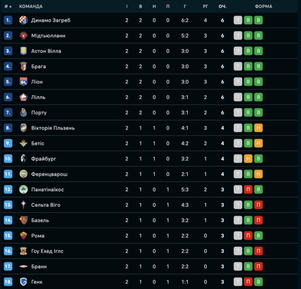 Наразі на чолі турнірної таблиці Ліги Європи перебувають “Динамо” Загреб, “Мідтьюлланн”, “Астон Вілла”, “Брага”, “Ліон”, “Лілль” та “Порту”, які набрали максимальні 6 очок.