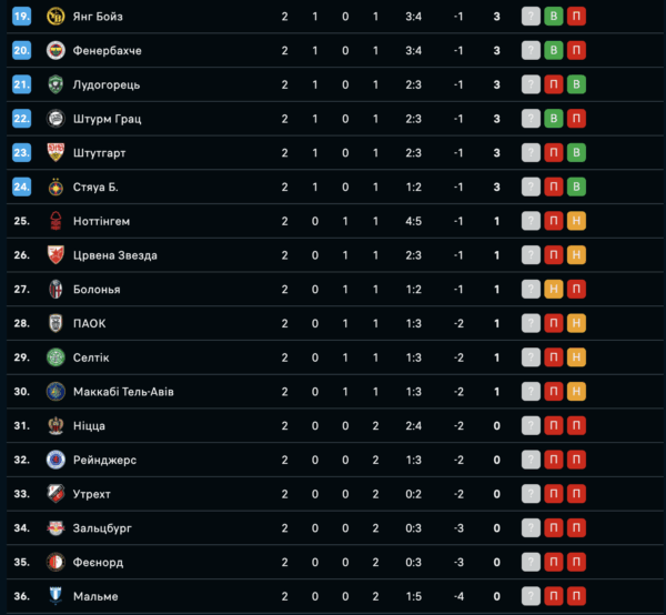 Турнірна таблиця Ліги Європи 2025/26 після 2-го туру основного етапу: