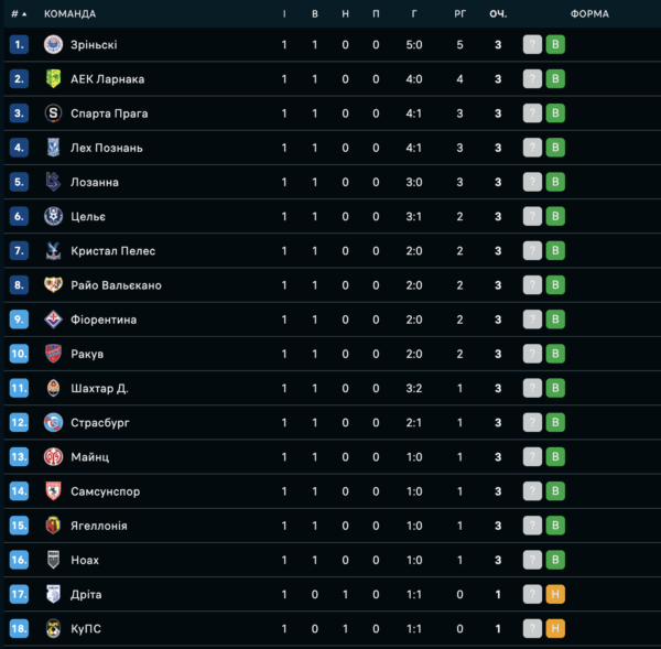 Наразі на чолі турнірної таблиці Ліги конференцій перебувають “Зрінські”, “АЕК” Ларнака, “Спарта”, “Лех”, “Лозанна-Спорт”, “Целє”, “Крістал Пелес”, “Райо Вальєкано”, “Фіорентина”, “Ракув”, “Шахтар”, “Страсбург”, “Майнц”, “Самсунспор”, “Ягеллонія” та “Ноа”, які виграли свої матчі.
