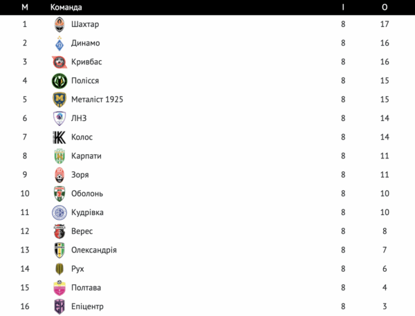 Відомо, якою є ситуація в турнірній таблиці Української Прем’єр-ліги за підсумками 8-го туру чемпіонату.