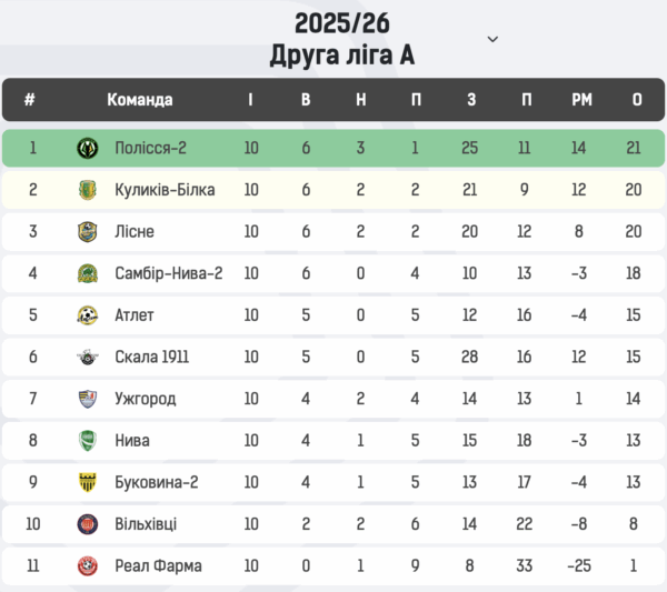 “Полісся-2” очолює турнірну таблицю Групи А Другої ліги. Також у топ-5 перебувають “Куликів-Білка” “Лісне”, “Самбір-Нива-2” та “Атлет”.