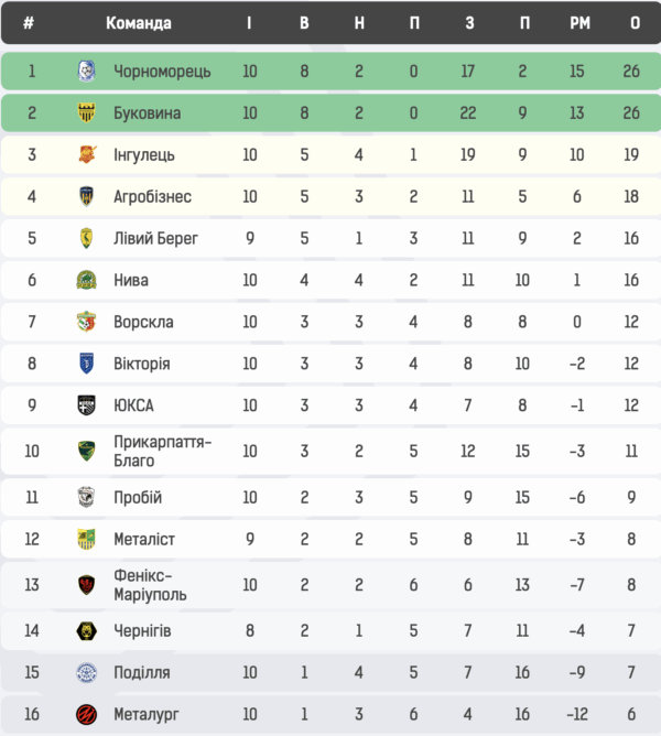 “Чорноморець” залишається лідером турнірної таблиці Першої ліги, маючи в активі 26 очок. “Буковина” має таку ж кількість очок, але поступається за додатковими показниками. “Інгулець” та “Агробізнес” знаходяться в зоні перехідних матчів із клубами УПЛ.
