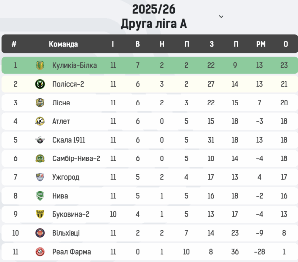 “Куликів-Білка” очолює турнірну таблицю Групи А Другої ліги. Також у топ-5 перебувають “Полісся-2”, “Лісне”, “Атлет” та “Скала 1911”.