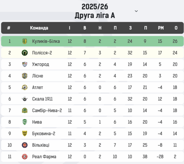 “Куликів-Білка” продовжує очолювати турнірну таблицю Групи А Другої ліги. Також у топ-5 перебувають “Полісся-2”, “Ужгород”, “Лісне” та “Атлет”.