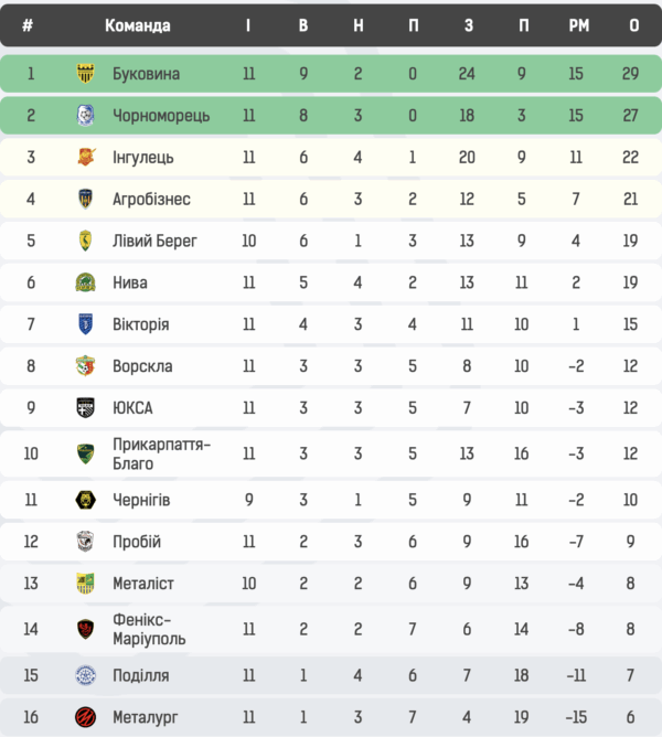 “Буковина” скористалася втратою очок “Чорноморця” та одноосібно очолила турнірну таблицю Першої ліги, набравши 29 очок. “Інгулець” та “Агробізнес” знаходяться в зоні перехідних матчів із клубами УПЛ.