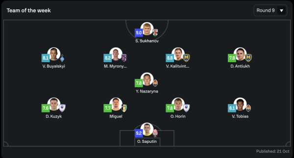 За даними аналітиків, до символічної збірної 9-го туру УПЛ потрапили Олександр Сапутін (“Зоря”), Денис Кузик (“ЛНЗ”), Мігел Кампуш (“Олександрія”), Олег Горін (“ЛНЗ”), Вінісіус Тобіас (“Шахтар”), Єгор Назарина (“Шахтар”), Віталій Буяльський (“Динамо”), Микола Миронюк (“Епіцентр”), Владислав Калітвінцев (“Металіст 1925”), Денис Антюх (“Металіст 1925”) та Сергій Суханов (“Оболонь”).
