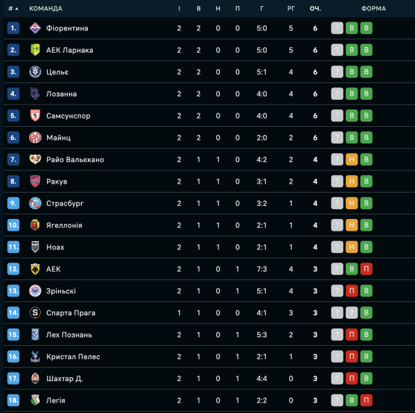 Наразі на чолі турнірної таблиці Ліги конференцій перебувають “Фіорентина”, “АЕК” Ларнака, “Целє”, “Лозанна-Спорт”, “Самсунспор” та “Майнц”, які набрали максимальні 6 очок.