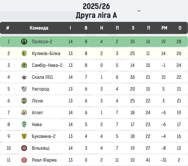 “Полісся-2” очолює турнірну таблицю Групи А Другої ліги. Щоправда, “Куликів-Білка”, який іде на 2-му місці, має гру в запасі. Також у топ-5 перебувають “Самбір-Нива-2”, “Скала 1911” та “Ужгород”.