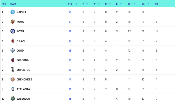 “Наполі” надалі очолює турнірну таблицю Серії А, випереджаючи “Рому” лише за додатковими показниками. “Інтер”, “Мілан” та “Комо” доповнюють чільну п’ятірку.