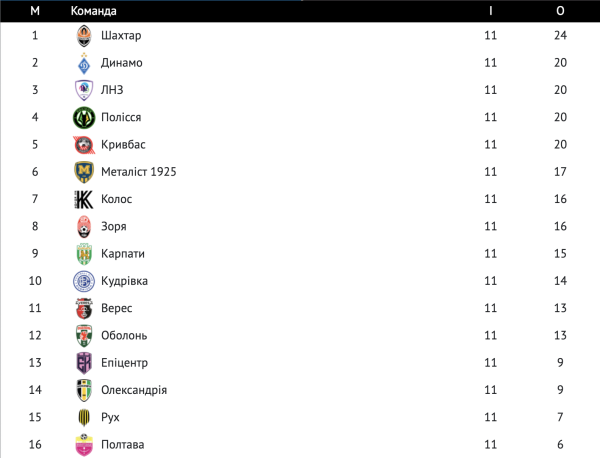Турнірна таблиця УПЛ після 11-го туру: