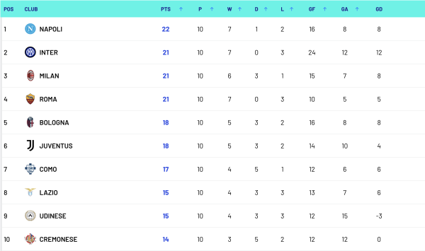 “Наполі” надалі очолює турнірну таблицю Серії А, набравши 22 очки. “Інтер”, “Мілан” “Рома” та “Болонья” доповнюють чільну п’ятірку.