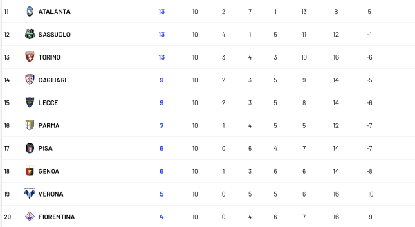 Відомо, якою є ситуація в турнірній таблиці італійської Серії А за підсумками 10-го туру чемпіонату.