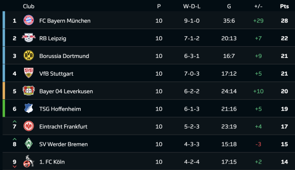 Відомо, якою є ситуація в турнірній таблиці німецької Бундесліги за підсумками 10-го туру чемпіонату.