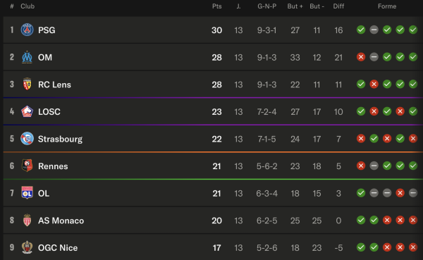 “ПСЖ” залишається лідером турнірної таблиці Ліги 1, набравши 30 очок. “Марсель”, “Ланс”, “Лілль” та “Страсбург” ідуть слідом.