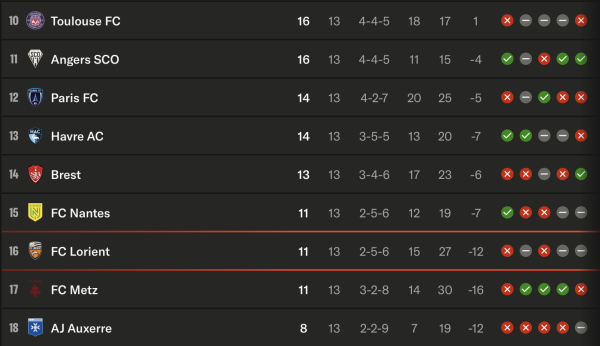 “Лор’ян” перебуває в зоні перехідних матчів, а “Мец” та “Осер” – у зоні вильоту.