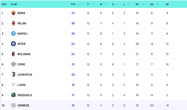 “Рома” стала новим лідером турнірної таблиці Серії А, набравши 27 очок. “Мілан”, “Наполі”, “Інтер” та “Болонья” доповнюють чільну п’ятірку.