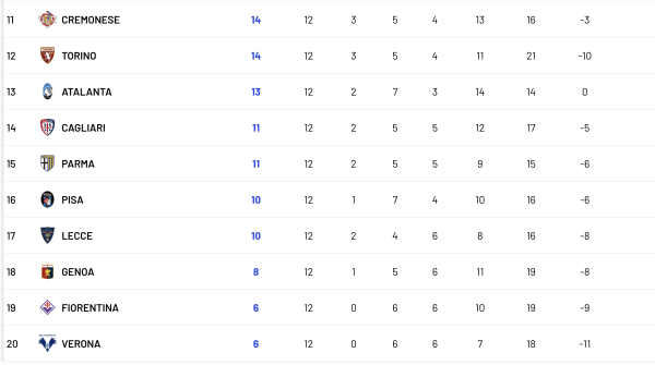 Турнірна таблиця Серії А після 12-го туру: