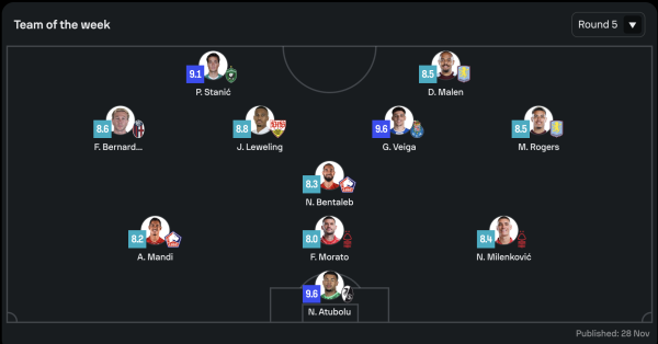 За даними аналітиків, до символічної збірної 5-го туру основного етапу Ліги Європи потрапили Ноа Атуболу (“Фрайбург”), Аїсса Манді (“Лілль”), Морато (“Ноттінгем Форест”), Нікола Міленкович (“Ноттінгем Форест”), Набіль Бенталеб (“Лілль”), Федеріко Бернардескі (“Болонья”), Джеймі Левелінг (“Штутгарт”), Габрі Вейга (“Порту”), Морган Роджерс (“Астон Вілла”), Петар Станіч (“Лудогорець”) та Доніелл Мален (“Астон Вілла”).