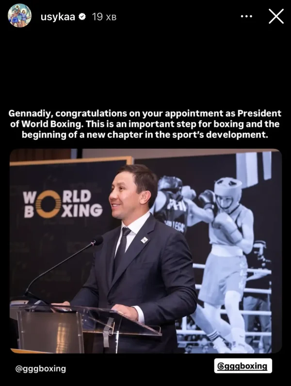 “Геннадію, вітаю тебе з призначенням на посаду президента World Boxing. Це важливий крок для боксу та початок нової глави в розвитку цього виду спорту”, – написав Усик.