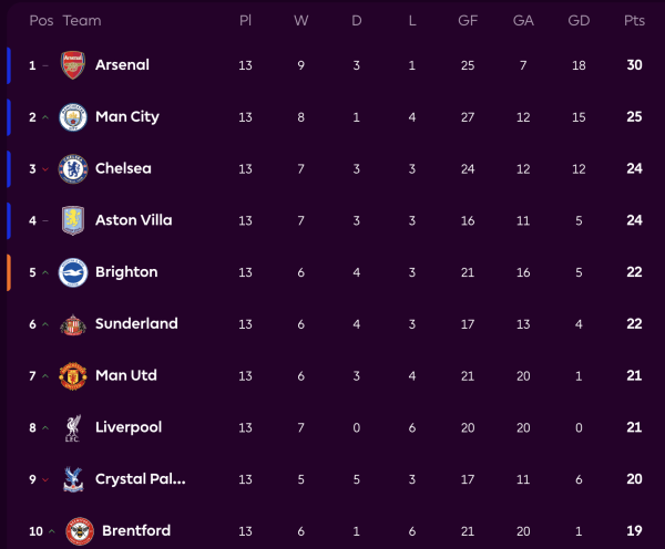 “Арсенал” очолює турнірну таблицю АПЛ, набравши 30 очок. Топ-5 доповнюють “Манчестер Сіті”, “Челсі”, “Астон Вілла” та “Брайтон”.