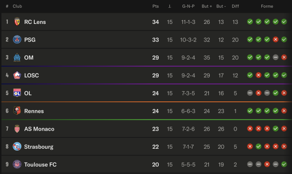 “Ланс” продовжує очолювати турнірну таблицю Ліги 1, набравши 34 бали після 15 турів. “ПСЖ”, “Марсель”, “Лілль” та “Ліон” ідуть слідом.