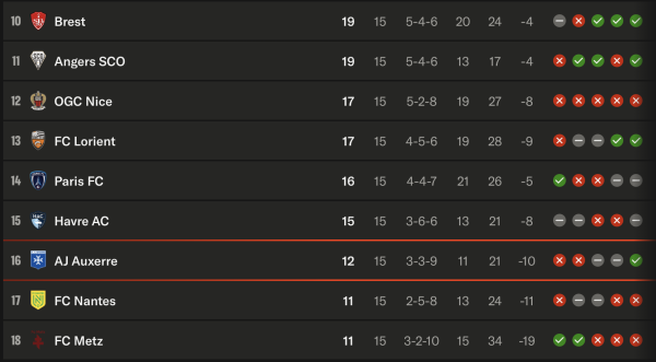 “Осер” перебуває в зоні перехідних матчів, а “Нант” та “Мец” – у зоні вильоту.