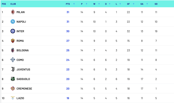 “Мілан” залишається лідером турнірної таблиці Серії А, набравши 31 заліковий бал. “Наполі”, “Інтер”, “Рома” та “Болонья” доповнюють чільну п’ятірку.