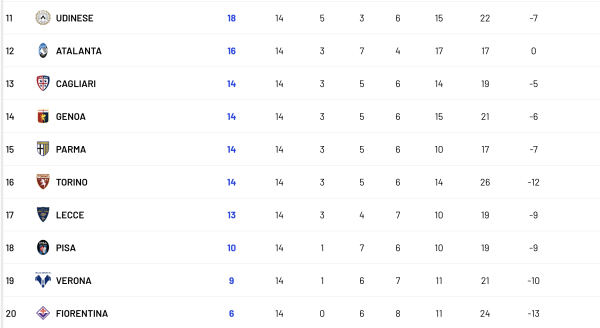 Відомо, якою є ситуація в турнірній таблиці італійської Серії А за підсумками 14-го туру чемпіонату.